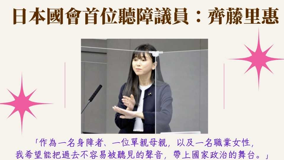 最近在日本政壇,有一位令人振奮的女性——齊藤里惠( Rie Saito)。1 歲時因腦膜炎高燒導致雙耳全聾的她,成長之路並不順遂。「作為一名身障者、一位單親母親,以及一名職業女性,我希望能把過去不容易被聽見的聲音,帶上國家政治的舞台。」