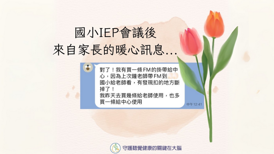 今年國小 IEP 會議中,有位家長細心發現基金會的「FM 調頻系統頸掛帶」已經斷裂。家長當場沒有多說什麼,便主動且默默地準備了新的掛帶給中心。這份體貼與用心,讓老師們深深感受到--孩子的成長,從來不是孤單的。