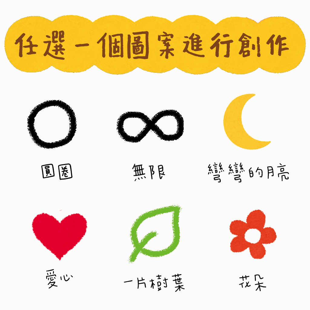 🔸作品需以下列其中一個圖案進行創作發想:圓圈、無限、彎彎的月亮、愛心、一片樹葉、花朵