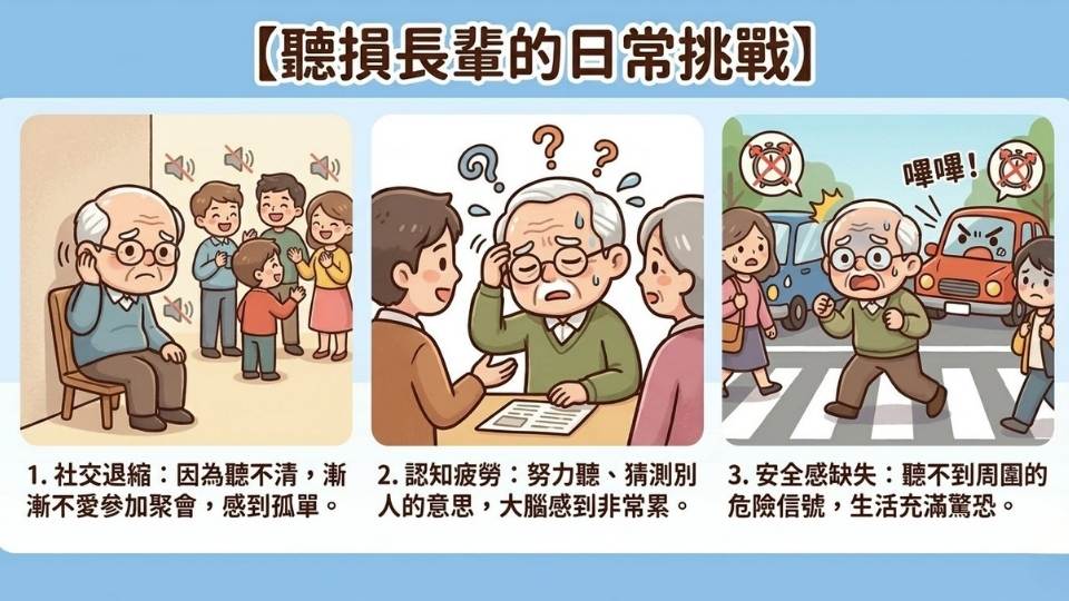 長輩的聽力損失,從來不只是「音量」問題。當大腦長期接收不到清晰的語音刺激,神經連結會變得疲弱,進而導致: