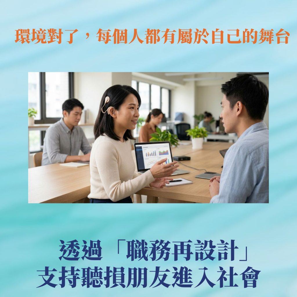 在台灣,我們也想為聽損朋友打開職場的那扇門。透過「職務再設計」,我們協助調整工作環境、導入適合的輔具,讓會議溝通不再費力,讓專業能被看見。因為我們相信——當環境夠友善,每個人,都能站上屬於自己的舞台。