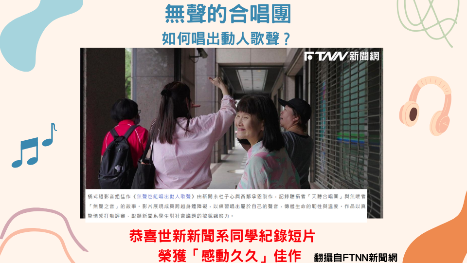 我們懷著無比欣喜的心情與您分享這份榮耀!由世新大學新聞系——杜子心與黃鄒承恩兩位同學製作的短片《無聲也能唱出動人歌聲》,在競爭激烈的第16屆「感動久久」全國校園短片徵選中,榮獲了橫式短影音組-佳作的肯定!